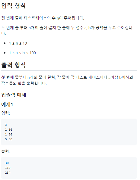 n번에 걸쳐 두 정수 a, b가 주어졌을 때, a부터 b까지의 짝수를 모두 합한 결과를 출력하는 프로그램을 작성해보세요.