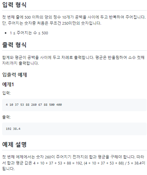 500이하의 정수가 총 10번 주어지는데, 250이상의 정수가 주어지면 마지막으로 주어진 수를 제외하고 주어진 모든 정수들의 합계와 평균을 구하는 프로그램을 작성해보세요. 단, 250이상의 정수가 없다면 10개의 합계와 평균을 계산하면 됨에 유의합니다.