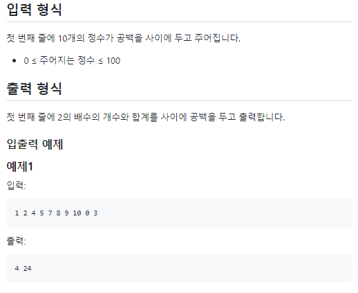 # 배열에 0이 있는지 확인합니다. 0이 나오지 않았을 경우 짝수의 개수와 합을 구합니다.