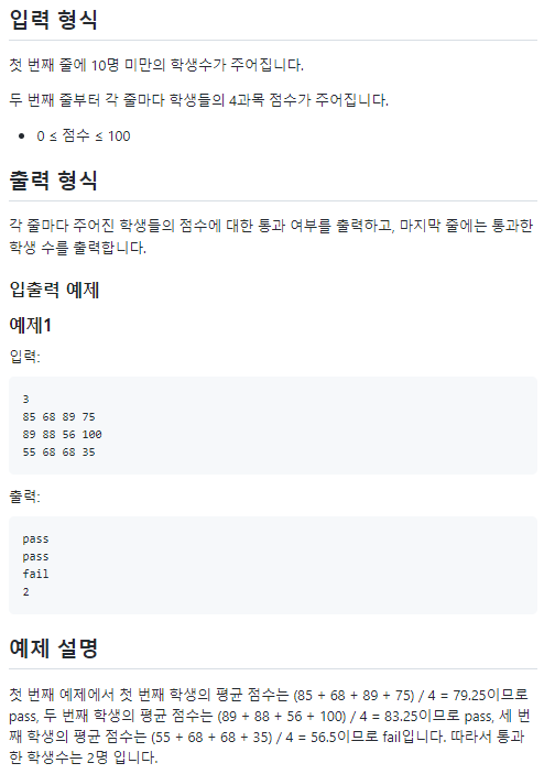 10명 미만의 학생들의 4과목 점수가 주어집니다. 평균이 60점 이상이면 통과입니다. 통과했다면 'pass'를 출력하고, 통과하지 못했다면 'fail'을 출력하고 통과한 사람의 수를 출력하는 프로그램을 작성해보세요.