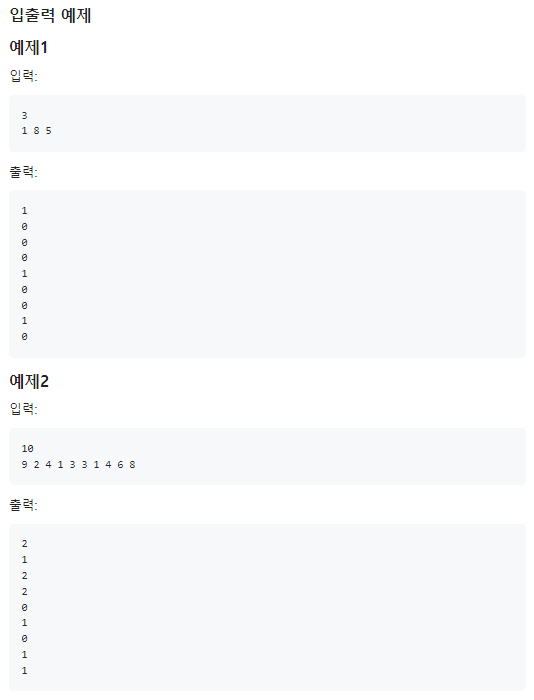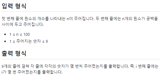 원소의 크기가 1이상 9이하인 n개의 원소가 주어졌을 때, 1부터 9까지 각각 몇 번씩 나왔는지를 출력하는 프로그램을 작성해보세요.