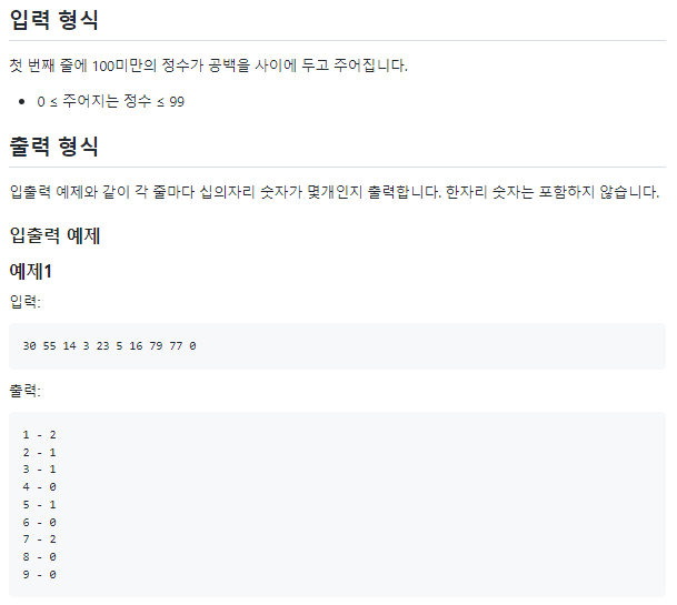 # 카운팅 배열을 통해 십의 자리수 각각의 빈도 저장, 0이 나오면 for문에서 빠져나오기