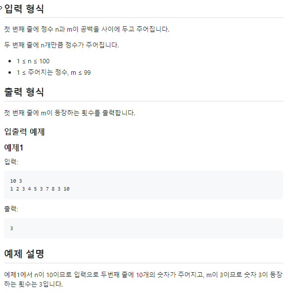 정수 n이 주어지면 그 횟수만큼 수가 주어집니다. 그 중 m이 몇 번 등장하는지 구해 출력하는 프로그램을 작성해보세요.