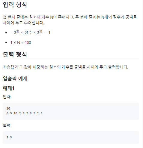 N개의 정수가 입력으로 주어졌을 때, 그 중 최솟값과 최솟값을 갖는 원소의 개수를 출력하는 코드를 작성해보세요.
