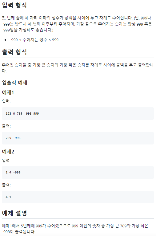 최대 100개의 세 자리 이하 정수가 차례로 주어지다가 999나 -999가 주어지면 입력 받는 것을 종료하고 이 숫자를 제외한 수 중 가장 큰 숫자와 가장 작은 숫자를 출력하는 프로그램을 작성해보세요.