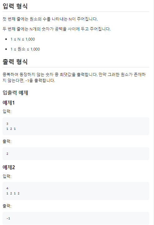 N개의 숫자가 주어졌을 때, 중복하여 등장하지 않는 숫자 중 최댓값을 구하는 프로그램을 작성해보세요.