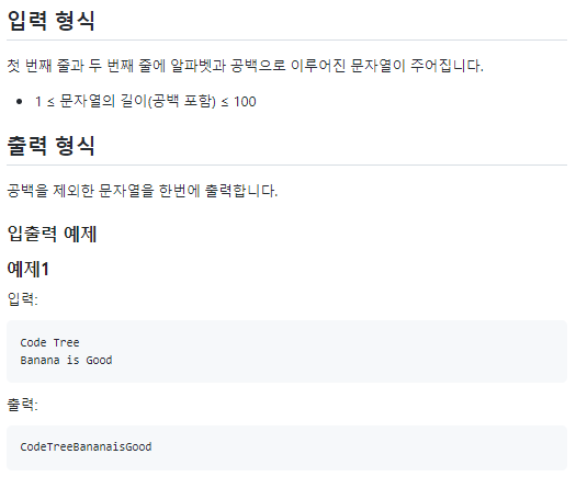 공백을 포함한 문자열이 두 줄 주어졌을 때, 주어진 문자열을 공백을 제외하여 다시 출력하는 프로그램을 작성해보세요.