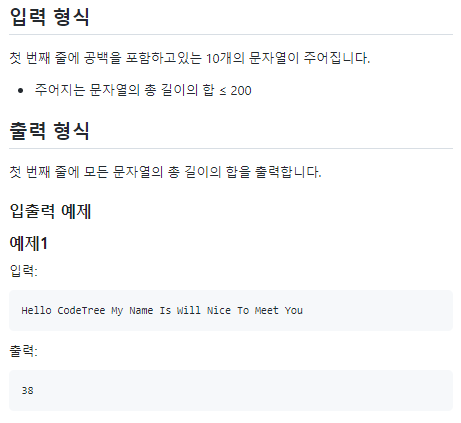 알파벳으로 이루어져 있고 공백을 포함한 10개의 문자열이 주어지면 모든 문자열의 총 길이의 합을 구하여 출력하는 프로그램을 작성해보세요.