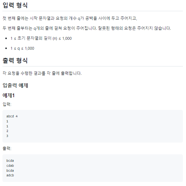 문자열 한 개 입력으로 주어지고 q개의 요청이 주어지면, 각 요청을 수행한 결과를 모두 출력하는 코드를 작성해보세요. 요청의 종류에는 아래의 세 가지가 있습니다.