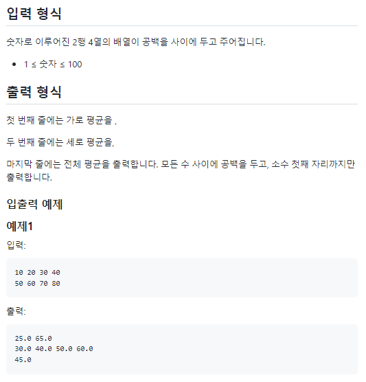 숫자로 이루어진 2행 4열의 배열이 주어지면 가로 평균, 세로 평균, 전체 평균을 소수 첫째 자리까지만 출력하는 프로그램을 작성해보세요.