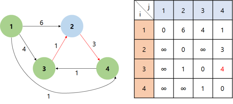 - 왼쪽과 같은 그래프가 존재할 때, 오른쪽 표는 i -> j로 가는 최단거리