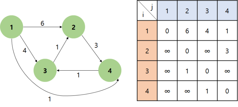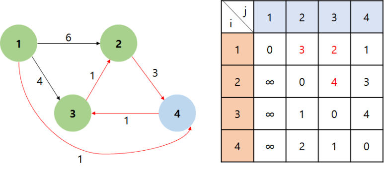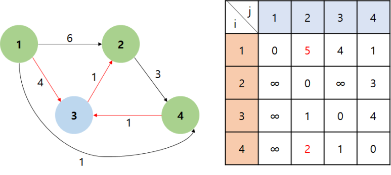 - 왼쪽과 같은 그래프가 존재할 때, 오른쪽 표는 i -> j로 가는 최단거리