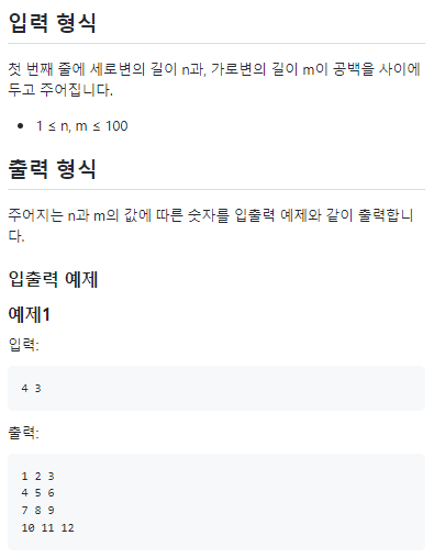 print(i * m + j + 1, end=" ") # 각 행당 열 개수(m)를 곰한 후 현재 열(j)의 값과 1을 더함