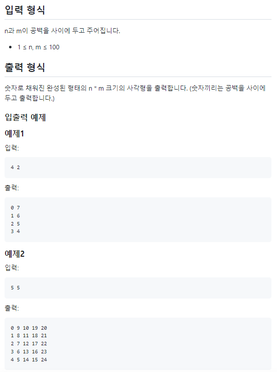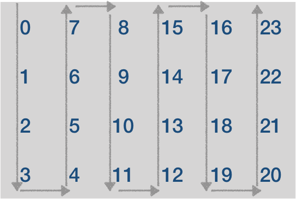 n * m크기의 직사각형에 숫자를 0부터 순서대로 1씩 증가시키며 왼쪽 위에서부터 시작하여 다음과 같이 지그재그 모양으로 숫자들을 쭉 채우는 코드를 작성해보세요.