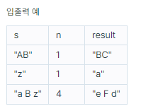 어떤 문장의 각 알파벳을 일정한 거리만큼 밀어서 다른 알파벳으로 바꾸는 암호화 방식을 시저 암호라고 합니다. 예를 들어 "AB"는 1만큼 밀면 "BC"가 되고, 3만큼 밀면 "DE"가 됩니다. "z"는 1만큼 밀면 "a"가 됩니다. 문자열 s와 거리 n을 입력받아 s를 n만큼 민 암호문을 만드는 함수, solution을 완성해 보세요.