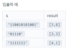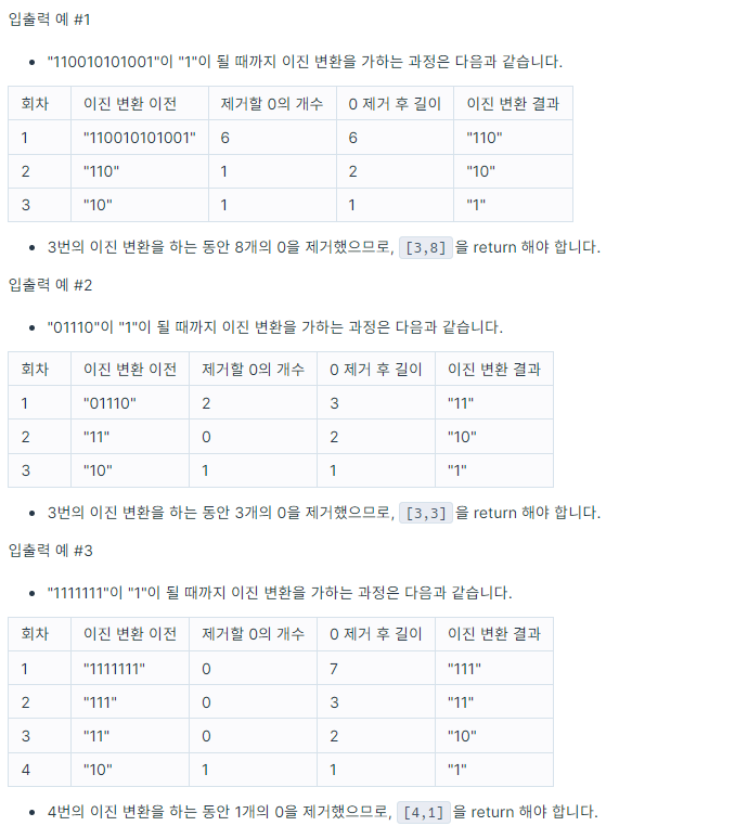 0과 1로 이루어진 문자열 s가 매개변수로 주어집니다. s가 "1"이 될 때까지 계속해서 s에 이진 변환을 가했을 때, 이진 변환의 횟수와 변환 과정에서 제거된 모든 0의 개수를 각각 배열에 담아 return 하도록 solution 함수를 완성해주세요.