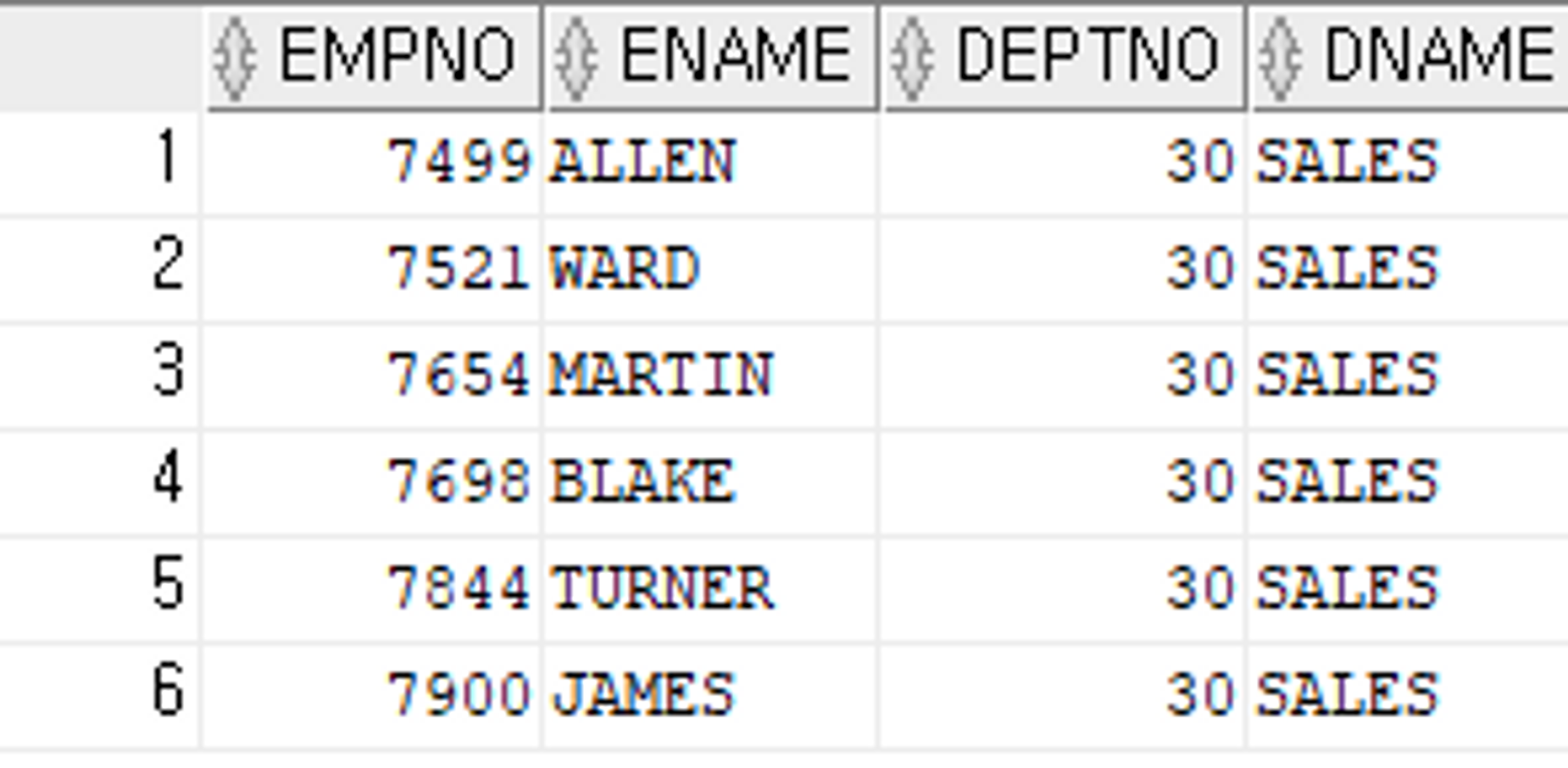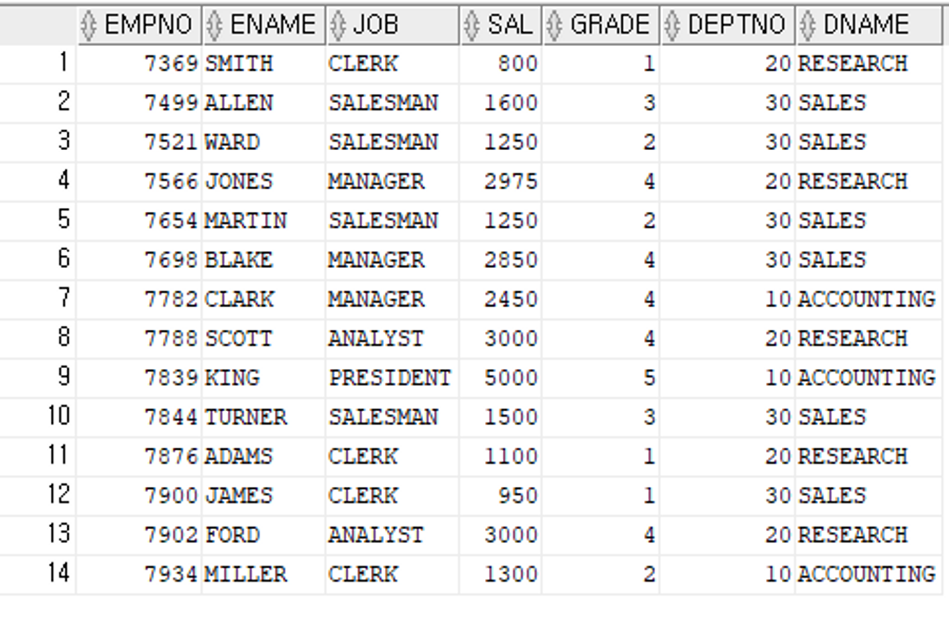 FROM EMP A, DEPT B WHERE A.DEPTNO = B.DEPTNO;
