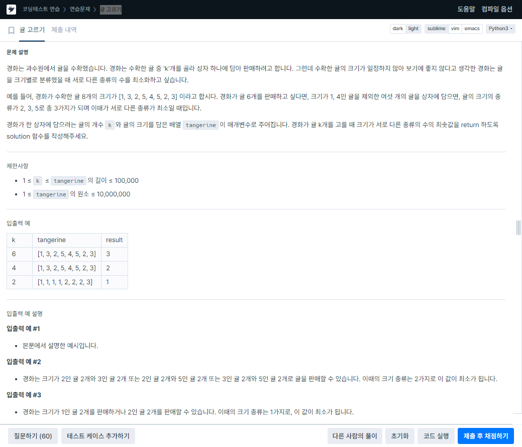 1. 우선 dict라는 딕셔너리를 만들어서 각 귤의 크기와 개수를 담는다.