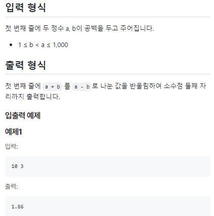 두 정수 a, b 를 입력받고, a + b를 a - b으로 나눈 값을 반올림하여 소수점 둘째 자리까지 출력하는 프로그램을 작성해보세요.