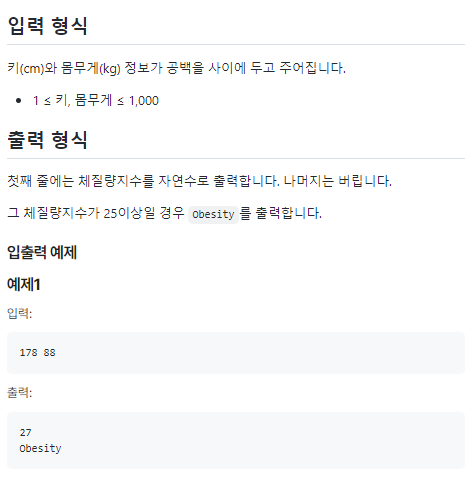 키와 몸무게를 자연수로 입력받아 첫 번째 줄에 체질량지수를 출력하고, 체질량지수가 25이상이면 비만(Obesity)이라는 메시지를 출력하는 프로그램을 작성해주세요.