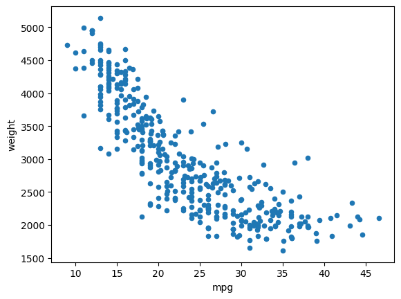 df.plot(kind = 'scatter', x = 'mpg', y = 'weight')