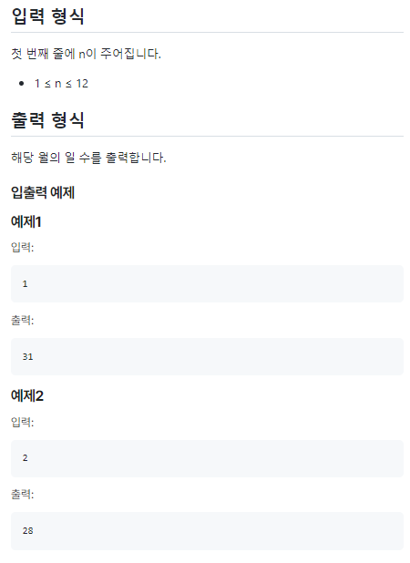 윤년이 아닌 해에 n월에는 몇 일이 있는지를 출력하는 프로그램을 작성하세요. 윤년이 아닌 해의 2월은 28일까지 있습니다.