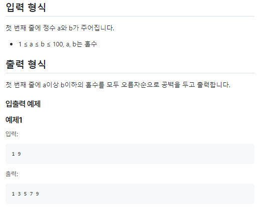 두 정수 a와 b가 주어지면 a이상 b이하의 홀수를 모두 오름차순으로 출력하는 프로그램을 작성해보세요.