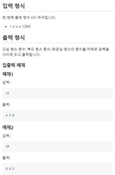 0일을 기점으로 2일마다 교실 청소를, 3일마다 복도 청소를, 12일마다 화장실 청소를 합니다. 날짜가 겹치는 날에는 주기가 더 긴 것을 하기로 했습니다. n일간 진행했을 때 각 장소의 청소 횟수를 차례로 출력하는 프로그램을 작성해주세요. 단, 시작 날인 0일에는 청소를 진행하지 않습니다.