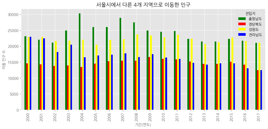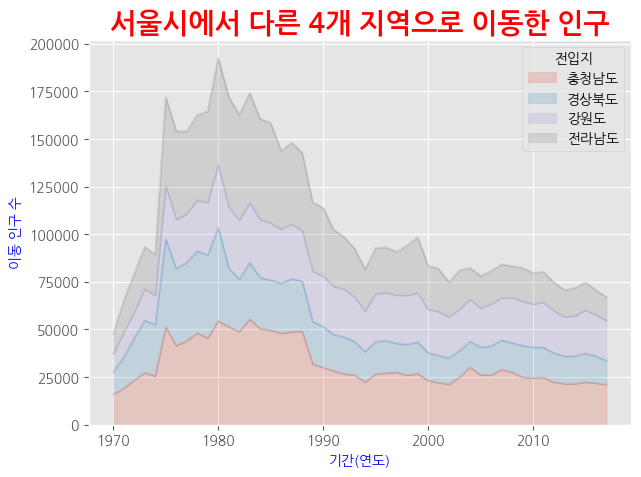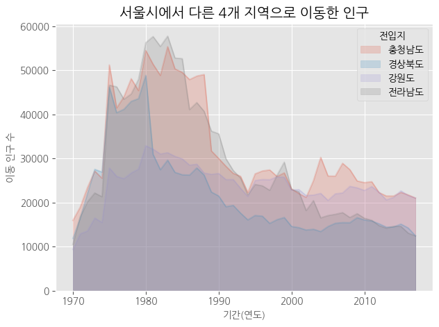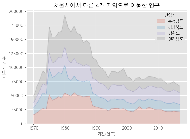 ax1.set_title("서울시에서 다른 4개 지역으로 이동한 인구", size = 20,