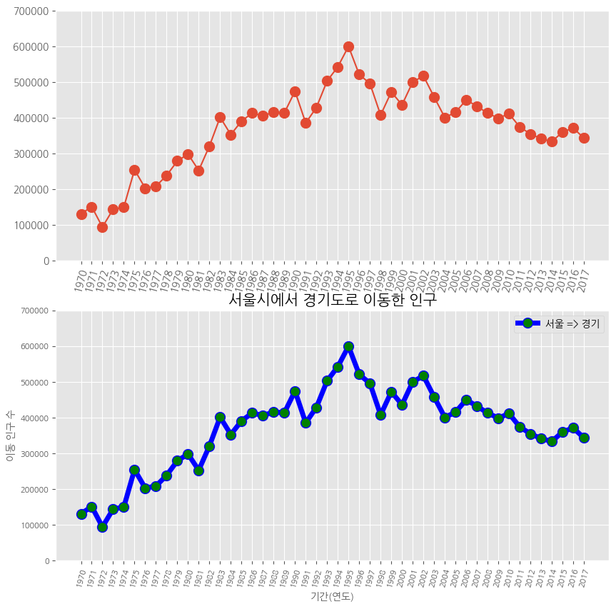 ax2.set_title("서울시에서 경기도로 이동한 인구", size = 15)