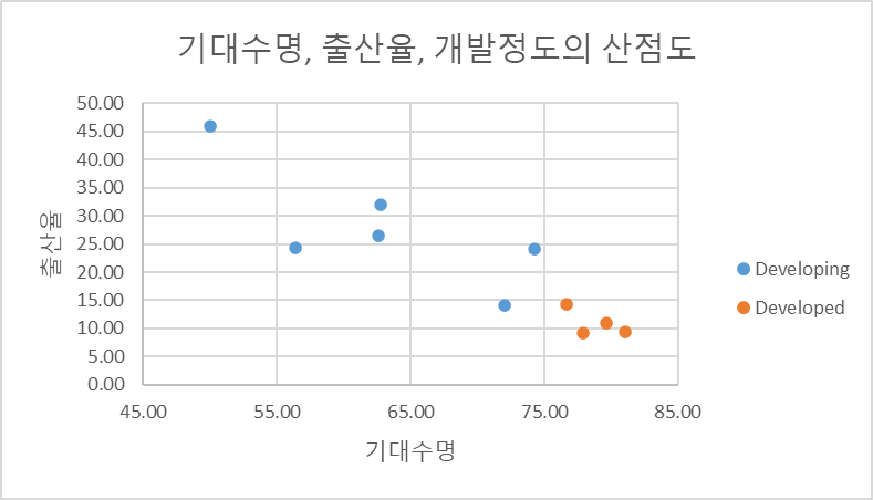 결과해석 : 개발도상국은 선진국에 비해서 기대수명은 낮고, 출산율은 높다.
