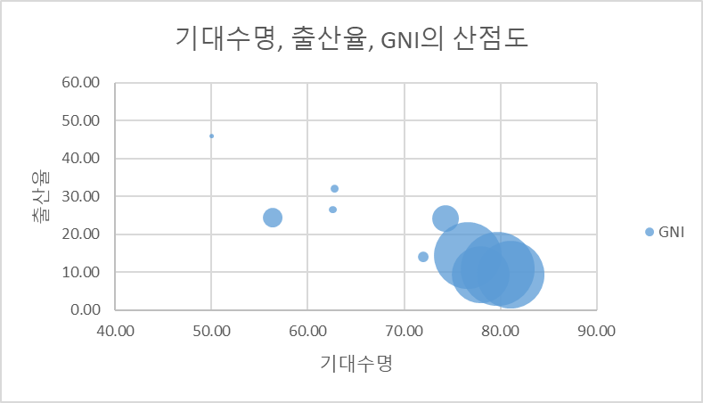 데이터 선택 - 삽입 - 차트 - 분산형 - 데이터 선택 - 범례 항목 편집 - 계열 1 편집 - 이름 : GNI / X 값 : 기대수명 / Y 값 : 출산율 / 계열 거품 크기 : GNI - 완료 → X축 서식, 축 제목 등 설정