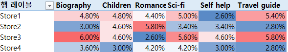피벗테이블 생성 - 데이터 선택 - 홈 - 조건부 서식 - 색조