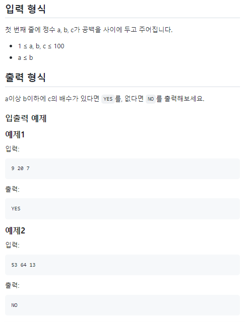 정수 a, b가 주어지면, a이상 b이하에 c의 배수가 단 하나라도 있는지 판단하는 프로그램을 작성해보세요.