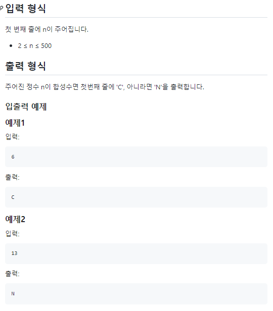 정수 n의 값이 주어지면 n이 합성수인지 아닌지 판별하는 프로그램을 작성해보세요. 합성수란, 1보다 큰 자연수 중 소수가 아닌 수 입니다.