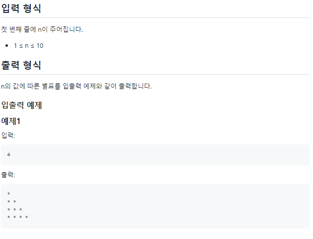 정수 n의 값을 입력받아 별표를 출력하는 프로그램을 아래 예를 참고하여 작성해보세요.
