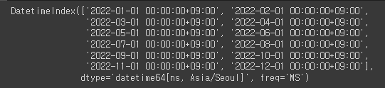 시계열 데이터를 만들어보자 옵션 ----------------------------------------------------------------------- - start : 시작 날짜 - end : 종료 날짜 - periods : Timestamp 개수 - freq : 빈도(월 간격, 월 시작일 등) - tz : 시간 기준 # Timestamp 배열 = range() sd_ts = pd.date_range(start = "2022-01-01", # 시작 날짜 end = None, # 끝 날짜 periods = 12, # Timestamp 개수 freq = 'MS', # 월 간격, 월 시작일 tz = 'Asia/Seoul') print(sd_ts) sd_ts = pd.date_range(start =..