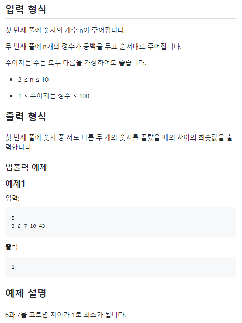 n개의 숫자가 오름차순으로 주어집니다. 이 중 서로다른 두 개의 숫자를 골랐을 때, 두 숫자의 차가 최소가 되는 경우의 그 차이를 출력하는 프로그램을 작성해보세요. # 변수 선언 및 입력 n = int(input()) arr = list(map(int, input().split())) # 숫자들이 오름차순으로 주어지기 때문에, # 두 숫자의 차의 최솟값은 반드시 인접한 두 숫자의 차 중에 최솟값이 있습니다. # 초기값을 적습니다. 최소가 될 첫 번째 후보입니다. min_val = arr[1] - arr[0] # 나머지 원소들을 보며 최솟값을 갱신합니다. for i in range(2, n): if min_val > arr[i] - arr[i - 1]:# 지금까지 나왔던 값들 보다 더 작은 값이라면 min..