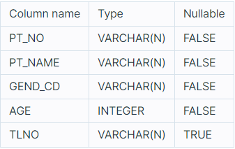 문제 설명 다음은 환자 정보를 담은 PATIENT 테이블과 의사 정보를 담은 DOCTOR 테이블, 그리고 진료 예약목록을 담은 APPOINTMENT에 대한 테이블입니다. PATIENT 테이블은 다음과 같으며 PT_NO, PT_NAME, GEND_CD, AGE, TLNO는 각각 환자번호, 환자이름, 성별코드, 나이, 전화번호를 의미합니다. DOCTOR 테이블은 다음과 같으며 DR_NAME, DR_ID, LCNS_NO, HIRE_YMD, MCDP_CD, TLNO는 각각 의사이름, 의사ID, 면허번호, 고용일자, 진료과코드, 전화번호를 나타냅니다. APPOINTMENT 테이블은 다음과 같으며 APNT_YMD, APNT_NO, PT_NO, MCDP_CD, MDDR_ID, APNT_CNCL_YN, APNT_CNC..